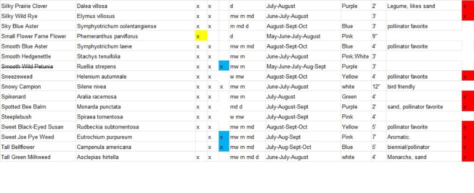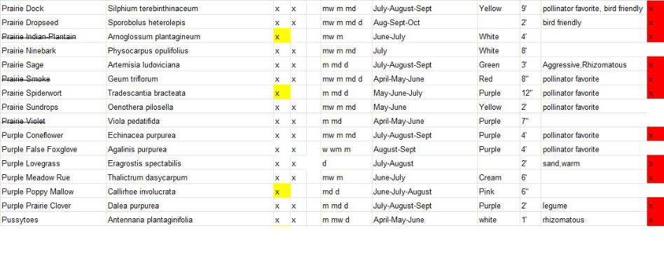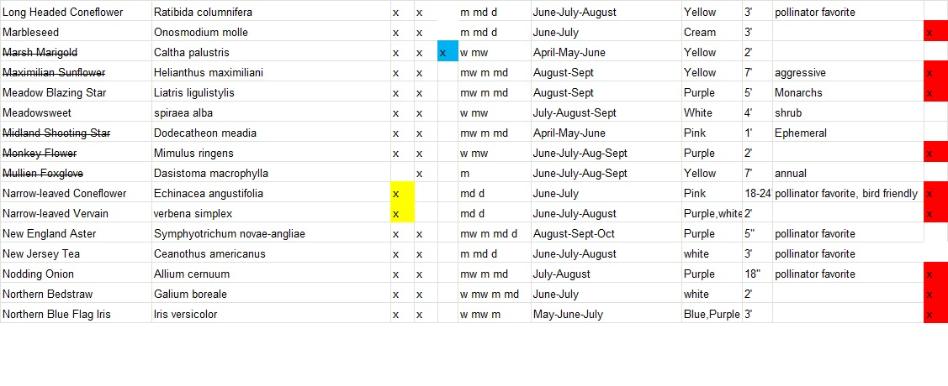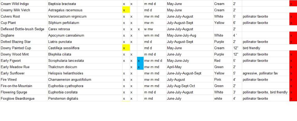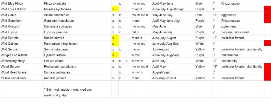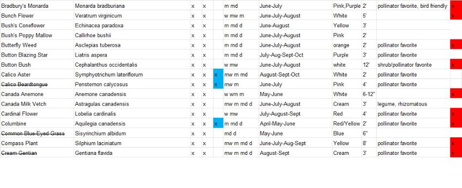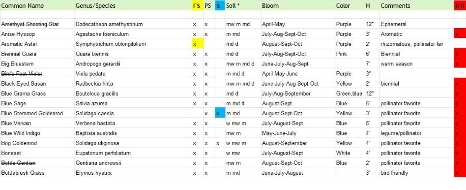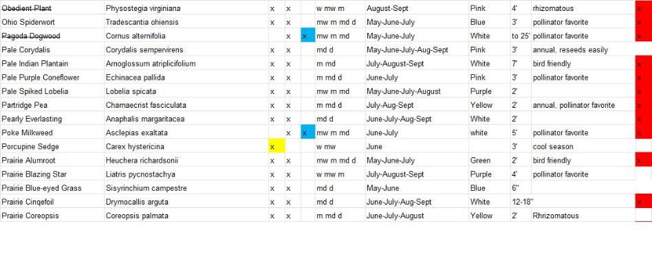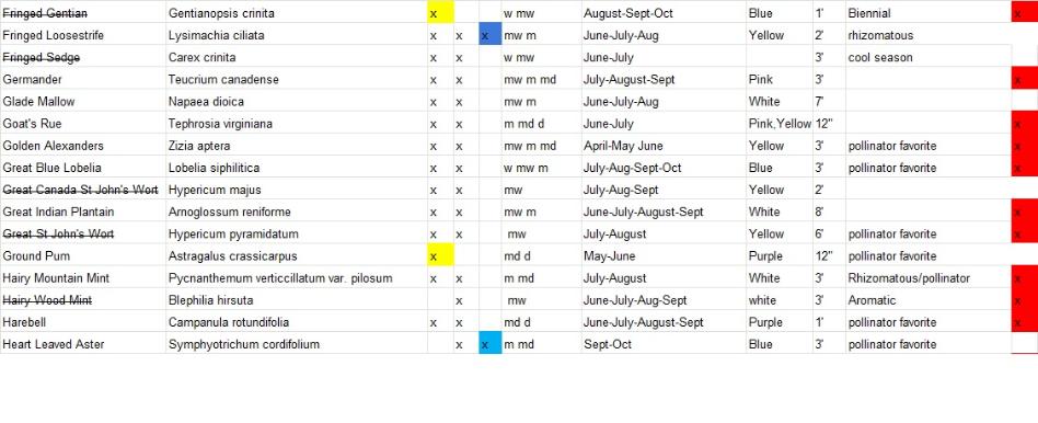 Plants with a strike-through are varieties that will not be available for this year. Varieties highlighted in yellow are full sun only, blue are full shade tolerant and red are deer resistant. We will add more information on bird and butterfly favorites shortly.